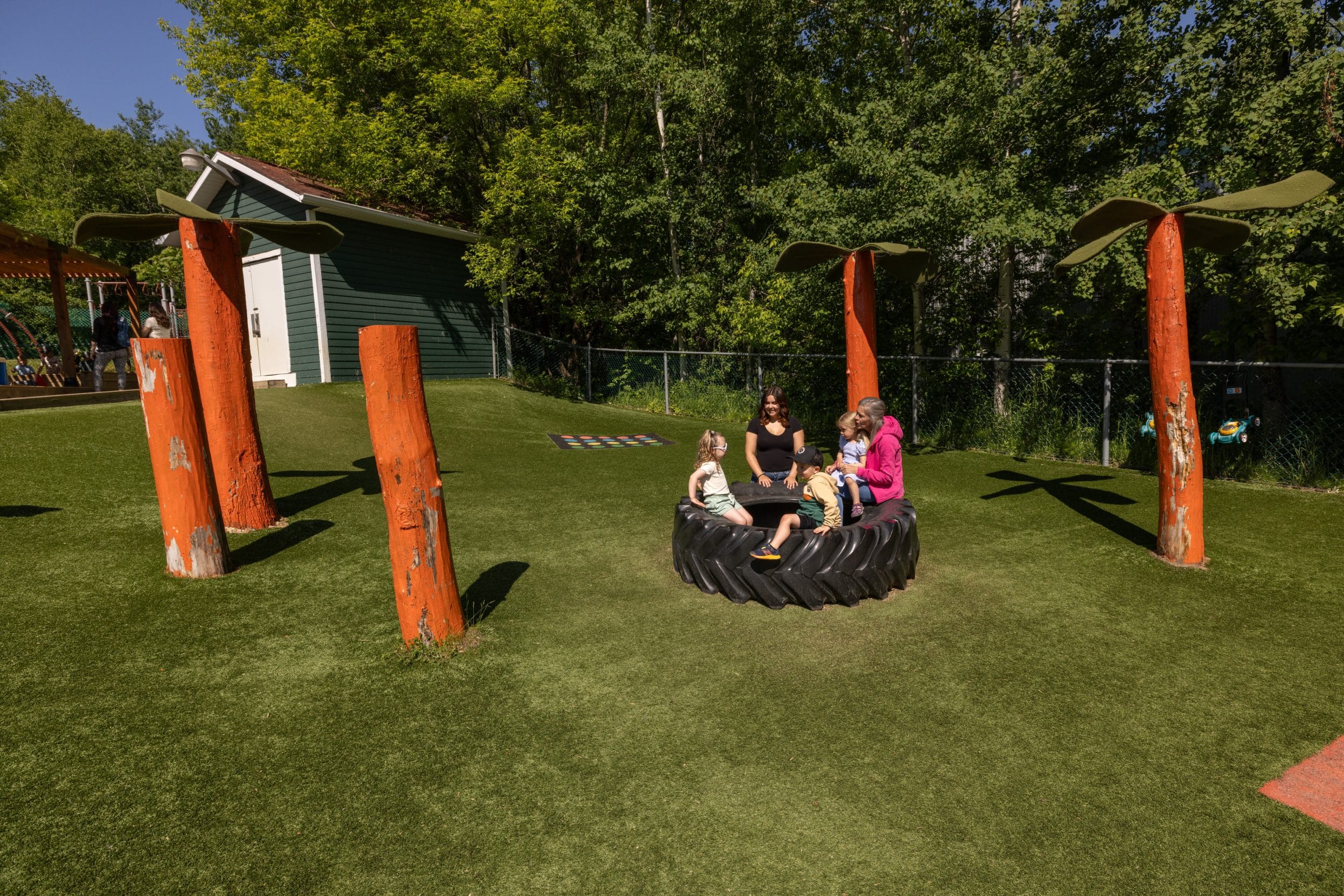 Notre cour est recouverte de tapis synthétique, ce qui permet aux enfants de sortir tous les jours, même après la pluie.