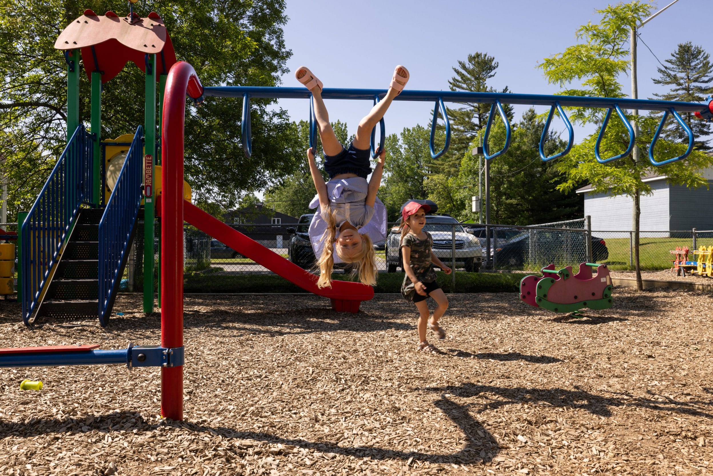 La cour extérieure est aménagée avec une grande variété de matériel stimulant : structure de jeux, ballons, cerceaux, pelles, ect. Une côte multifonction permet de glisser sur la neige l’hiver, et se transforme en glissade d’eau l’été, pour le plus grand plaisir des enfants!