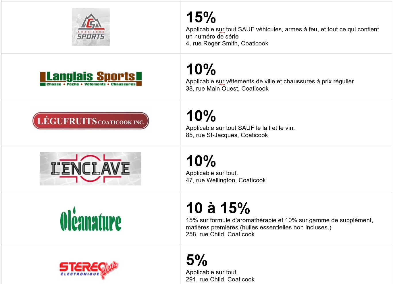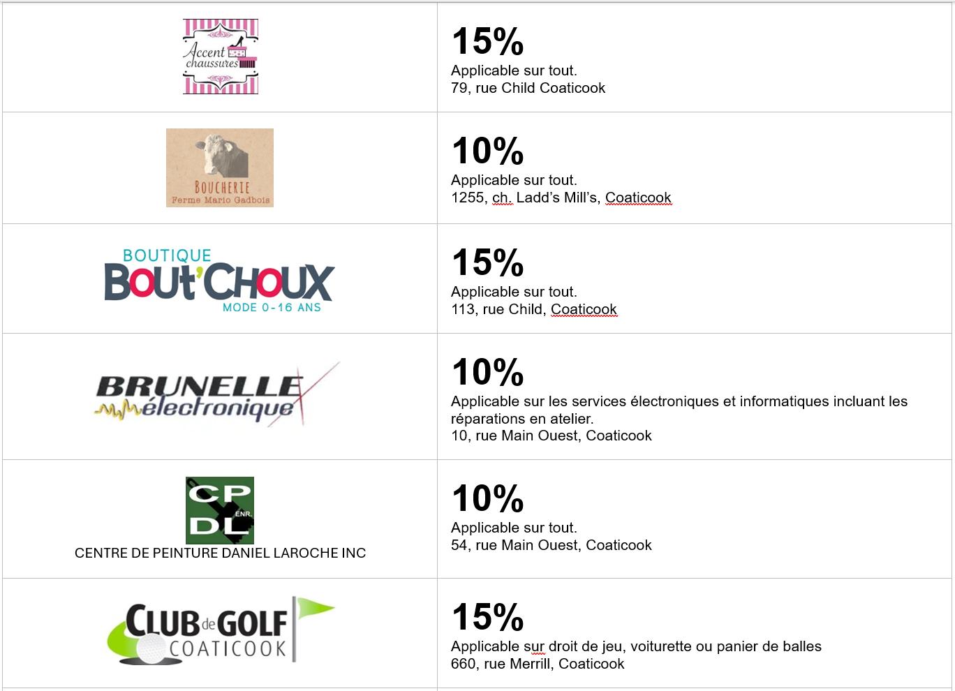 Pour souligner l’importance de votre travail auprès des enfants de nos citoyens, ainsi que l’engagement exceptionnel que vous démontrez chaque jour, nos commerçants se sont mobilisés afin d’offrir aux éducatrices et éducateurs du CPE L’Enfantillage de Coaticook des rabais exclusifs, accessibles grâce à notre Carte privilège.